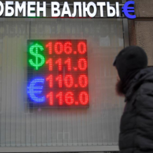 11月28日,在俄罗斯首都莫斯科,行人经过一家外汇兑换点。