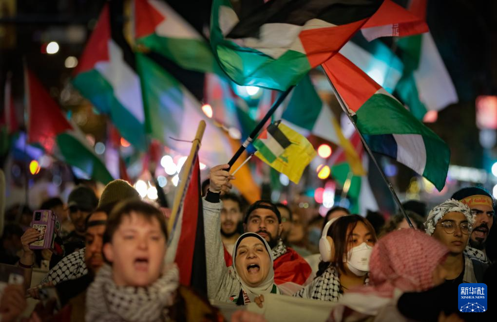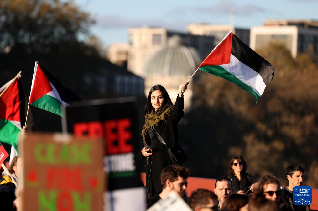 2023年11月11日,巴勒斯坦支持者在英国首都伦敦参加游行集会,呼吁在加沙地带尽快实现停火。