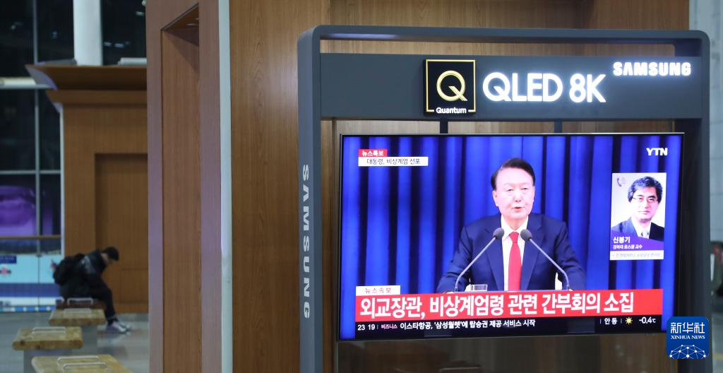 12月3日,在韩国首尔火车站,电视上播放总统宣布紧急戒严令的画面。韩国总统尹锡悦3日晚在首尔龙山总统府发表紧急谈话,发布紧急戒严令。新华社记者 姚琪琳 摄