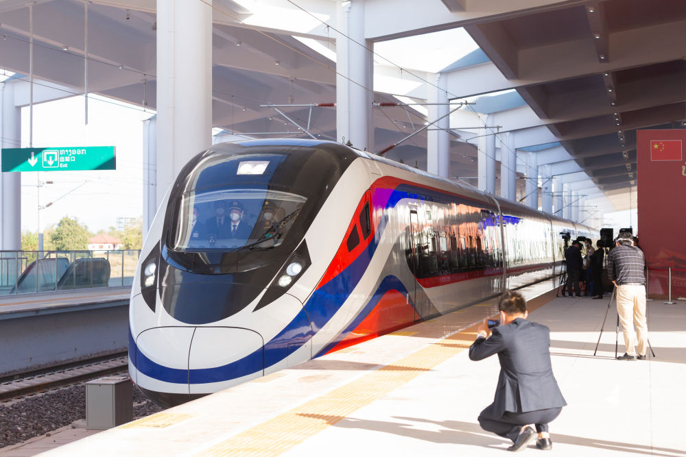 2021年12月3日,中老铁路全线开通运营。这是老挝万象站内的“澜沧号”动车组列车发车。