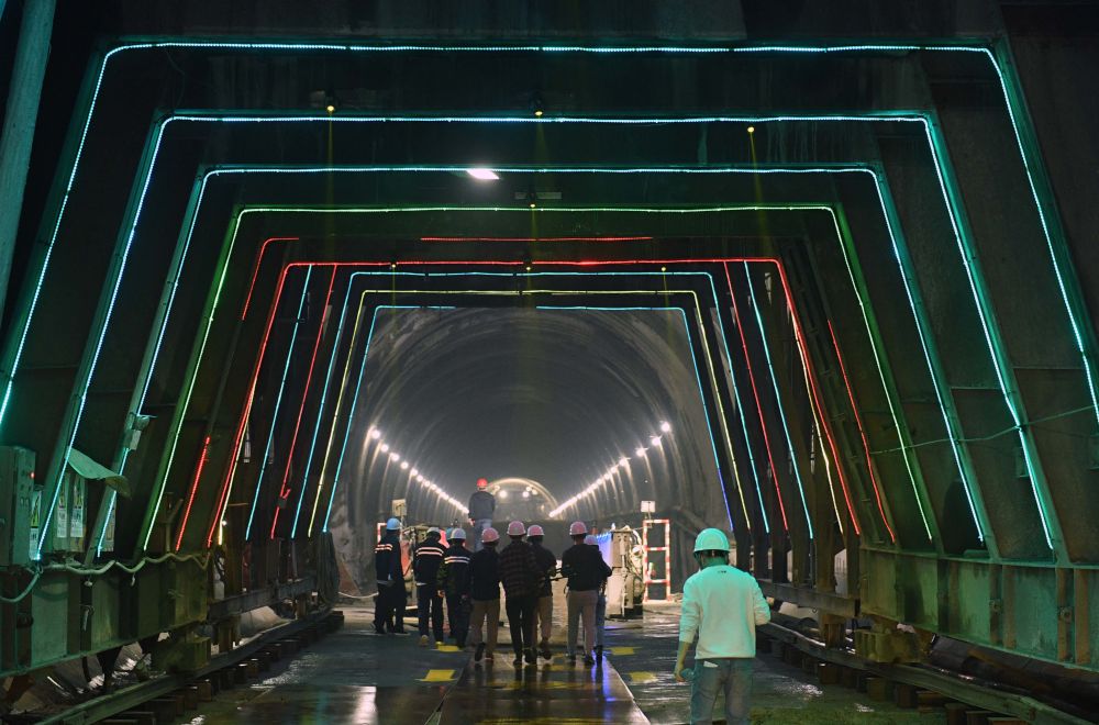 2020年3月13日,中铁十二局集团公司建设者从万和隧道衬砌台车下经过。当日,中老铁路万和隧道顺利贯通,这是中老铁路全线贯通的首座万米以上长隧道。