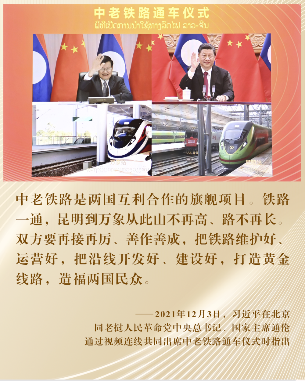 2021年12月3日,中共中央总书记、国家主席习近平在北京同老挝人民革命党中央总书记、国家主席通伦通过视频连线共同出席中老铁路通车仪式。