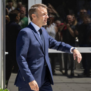 6月9日,在法国勒图凯市,法国总统马克龙在参加欧洲议会选举投票后走出投票站。新华社发(弗兰克·博阿姆摄)