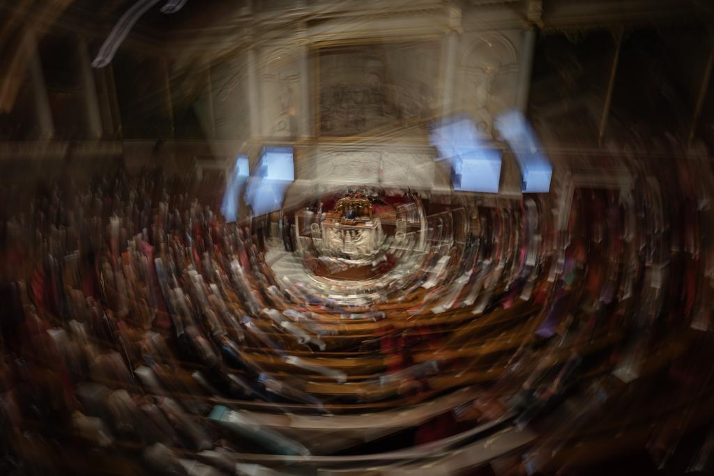 这是法国巴黎的国民议会就对政府不信任动议投票表决前的辩论现场(12月4日摄)。新华社发(奥雷利安·莫里萨尔摄)