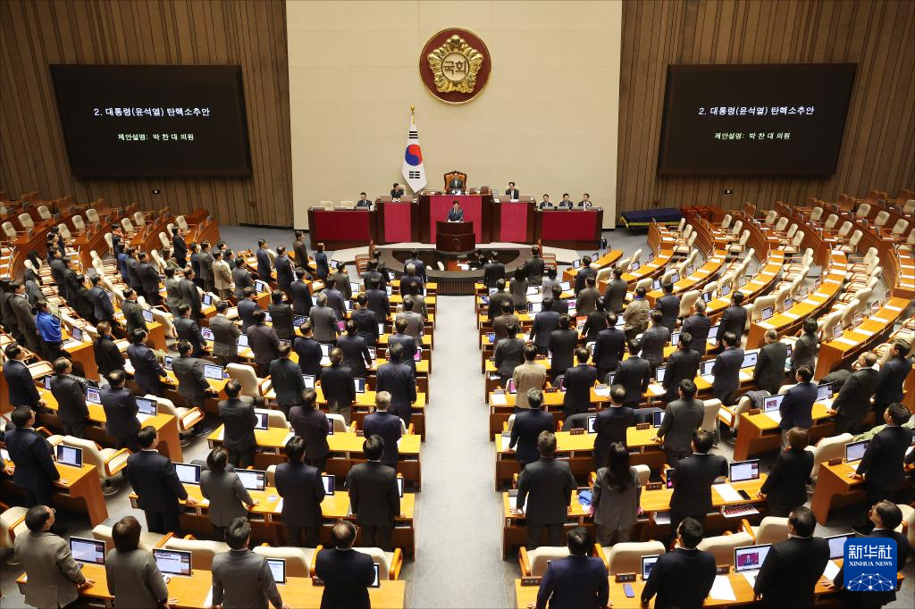 12月7日,在韩国首尔,韩国国会议员听取国会议员朴赞大发表弹劾总统尹锡悦动议案说明。新华社发