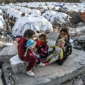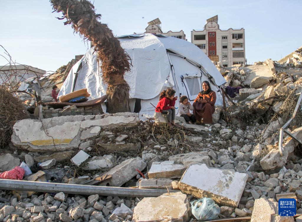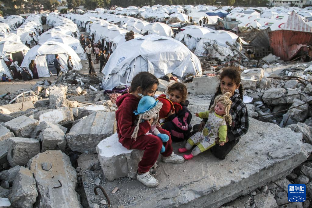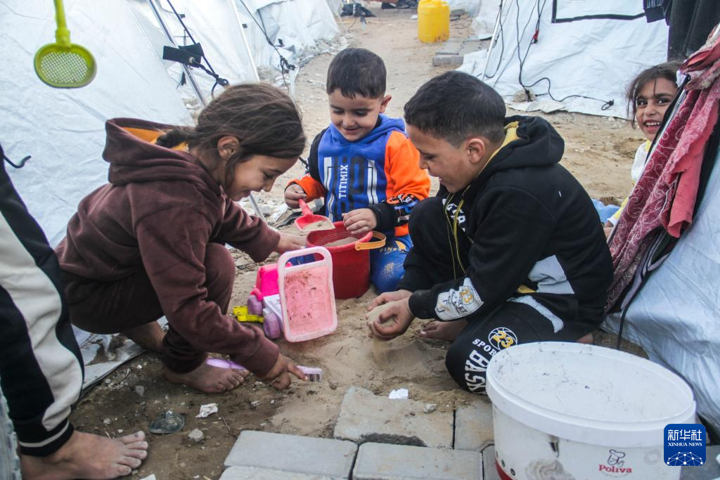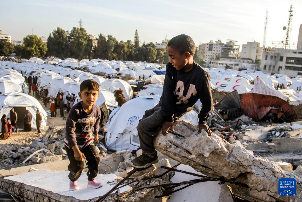 12月9日,在加沙地带加沙城,流离失所的孩子们在一处临时帐篷区玩耍。