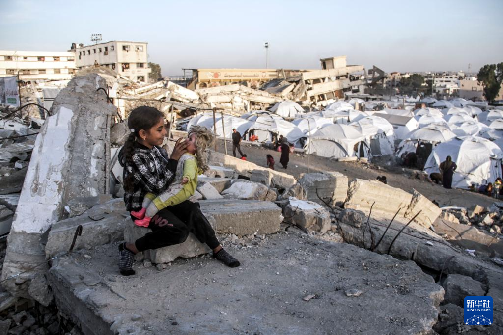 12月9日,在加沙地带加沙城,一名流离失所的女孩在一处临时帐篷区玩玩具。