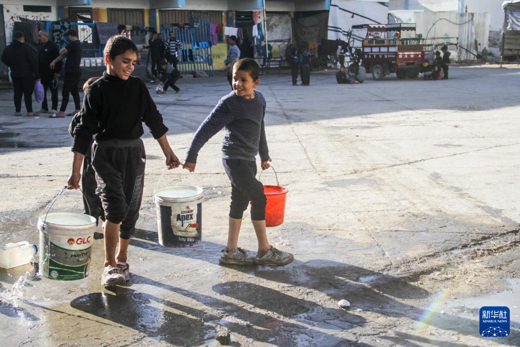 12月9日,在加沙地带加沙城,流离失所的孩子们用水桶打水。