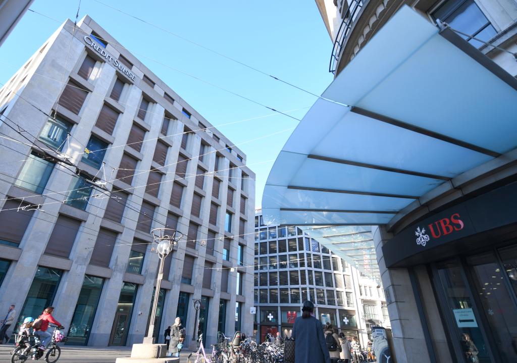 这是2023年3月20日在瑞士日内瓦拍摄的瑞士信贷银行(左)和瑞银集团。新华社记者连漪摄