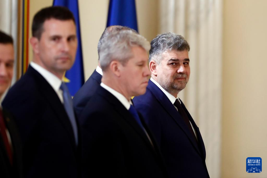 12月23日,在罗马尼亚首都布加勒斯特总统府,新任总理马切尔·乔拉库(右一)出席宣誓就职仪式。新华社发(克里斯泰尔摄)