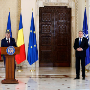 12月23日,罗马尼亚新一届政府总理乔拉库(左)在首都布加勒斯特接受总统约翰尼斯的任命后发表讲话。