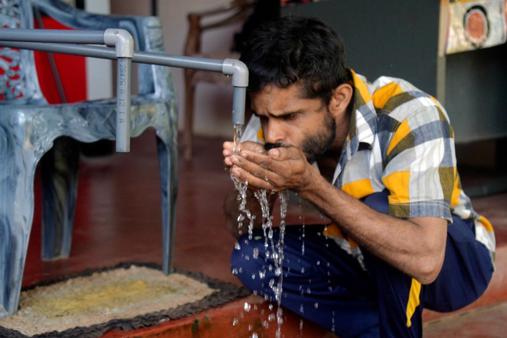 10月2日,在斯里兰卡中北部地区尼迪亚村,村民正在中国援建的饮用水装置前饮水。新华社发(加扬·萨米拉摄)