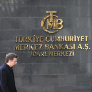 12月26日,在土耳其首都安卡拉,一名男子经过土耳其中央银行的标识。