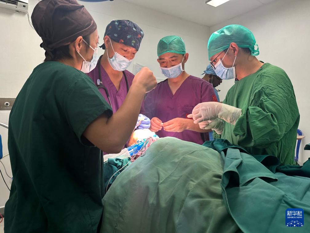 2024年5月27日,在东帝汶首都帝力的帝力国立医院,中国援东帝汶医疗队手术团队成员和成都医学院第一附属医院医生为患儿进行唇裂修补手术。新华社发(骆伟摄)