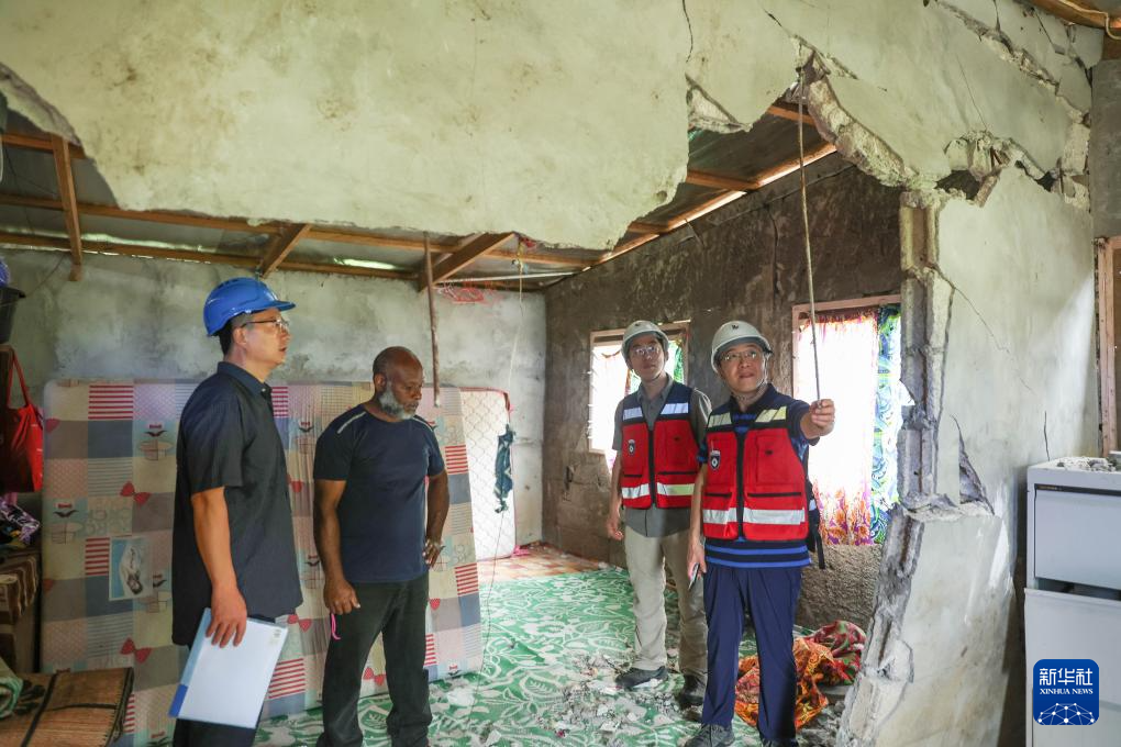 1月1日,在瓦努阿图维拉港,中国地震局专家组成员查看房屋受损情况。