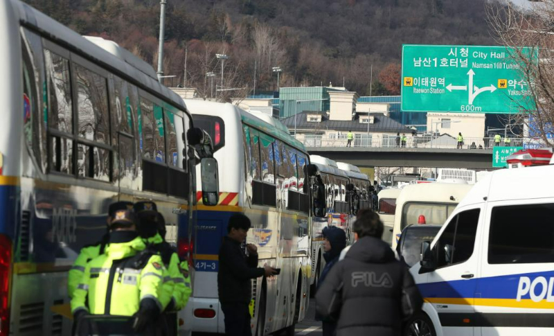 1月3日,大量警方车辆停在韩国首尔龙山区汉南洞的总统官邸附近。新华社记者姚琪琳摄