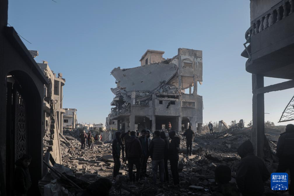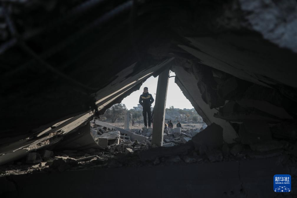 1月3日,在加沙地带中部迈加齐难民营,当地民众查看被以军袭击毁坏的房屋。新华社发(里泽克·阿卜杜勒贾瓦德 摄)