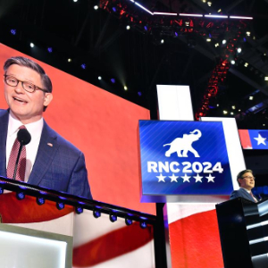 这是迈克·约翰逊在美国密尔沃基举行的共和党全国代表大会上讲话的资料照片(2024年7月15日摄)。