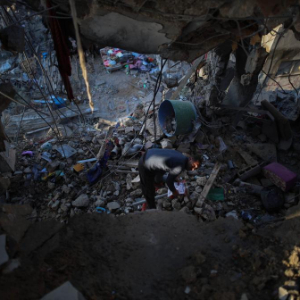 1月6日,在加沙地带中部的布赖杰难民营,一名男子查看遭以军轰炸损毁的房屋。