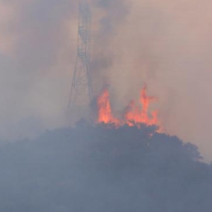 1月11日,野火的浓烟和火焰出现在美国加利福尼亚州洛杉矶曼德维尔峡谷的山丘顶部。