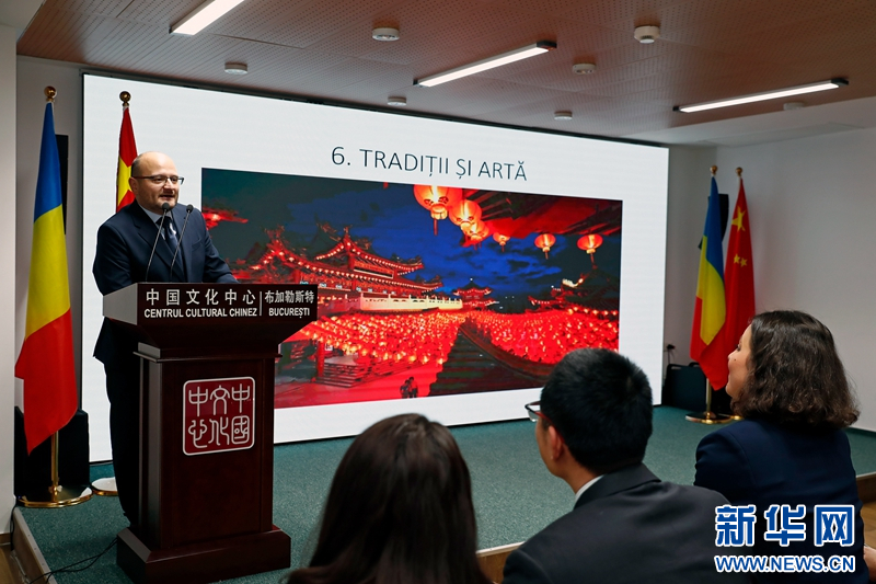 1月13日,在罗马尼亚首都布加勒斯特中国文化中心,维纳斯之旅旅行社总经理克里斯蒂安·丘丘雷亚努和观众分享中国旅行经历。克里斯泰尔 摄