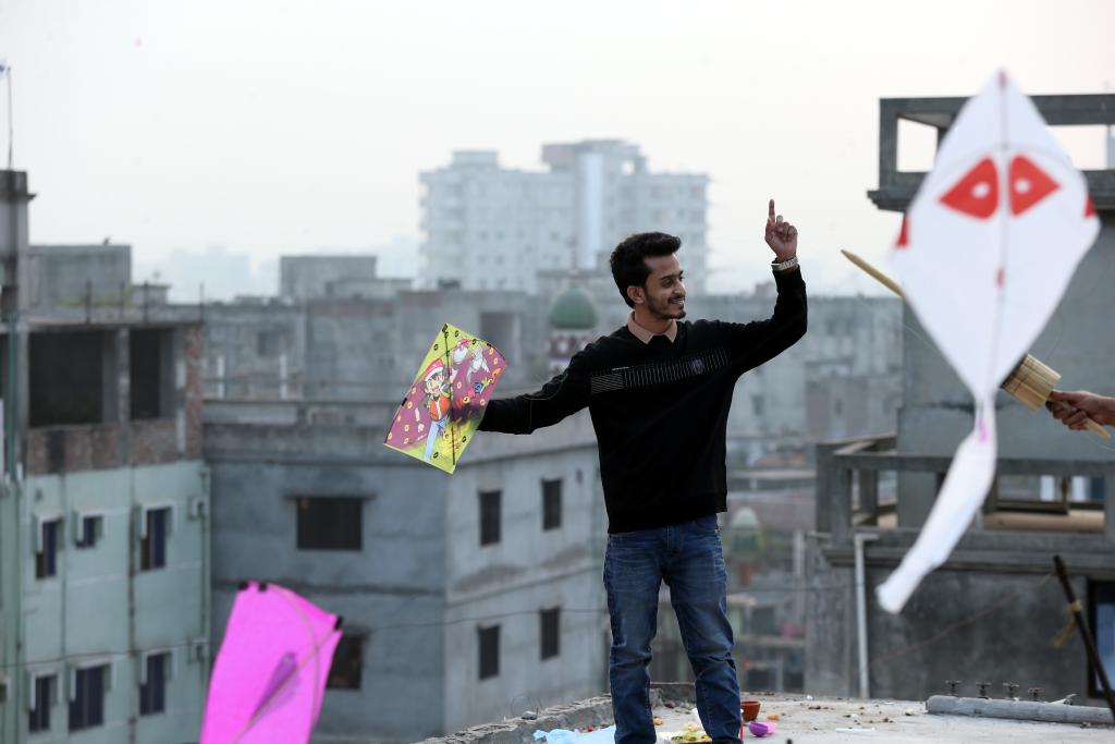 1月14日,在孟加拉国达卡,人们在屋顶放风筝。