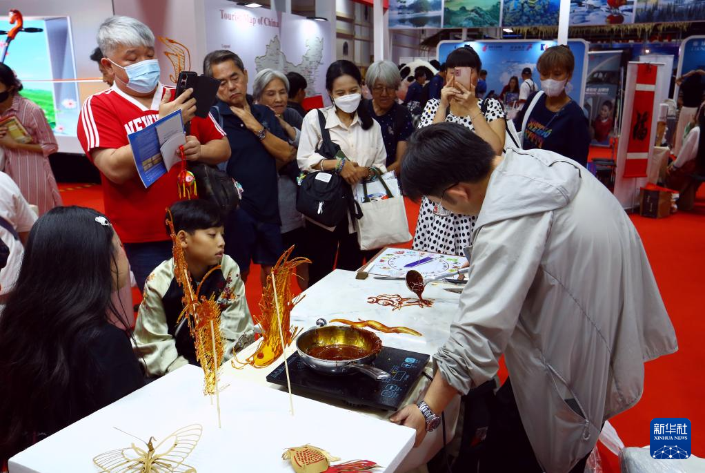 1月16日,人们在泰国曼谷举办的泰国国际旅游展上观看中国手工艺者表演制作糖画。新华社记者 孙玮彤 摄