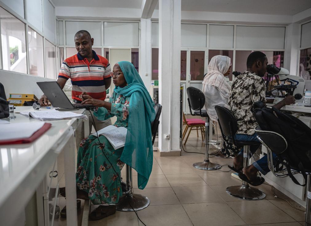 2024年1月11日,曾在中国留学的卡迈勒·赛义德·阿卜杜拉(左)在位于科摩罗首都莫罗尼的国家疟疾防治中心实验室与工作人员交流。