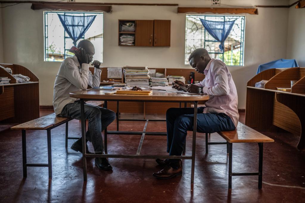 2024年6月18日,在肯尼亚图尔卡纳郡卡库马难民营内,毕生希望女子中学的教师在批改作业。