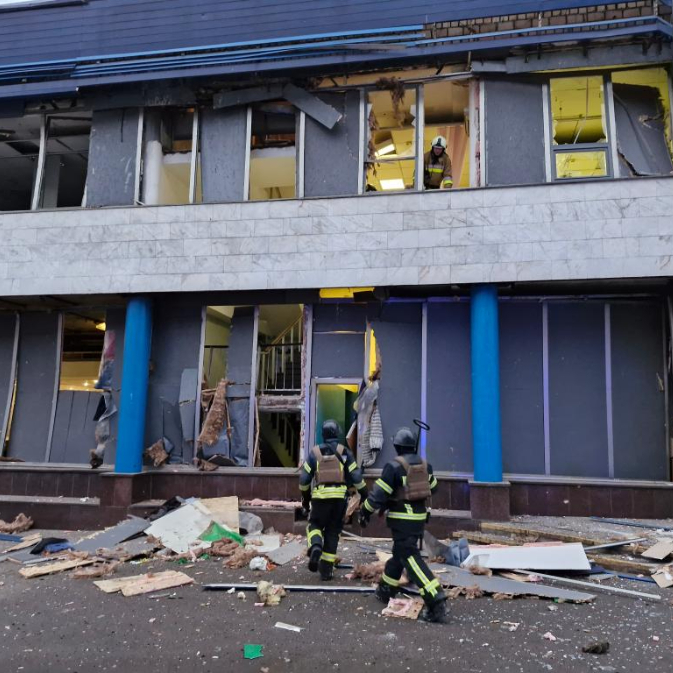 1月18日,在乌克兰首都基辅市,乌国家紧急情况局工作人员在受损的建筑内搜救。