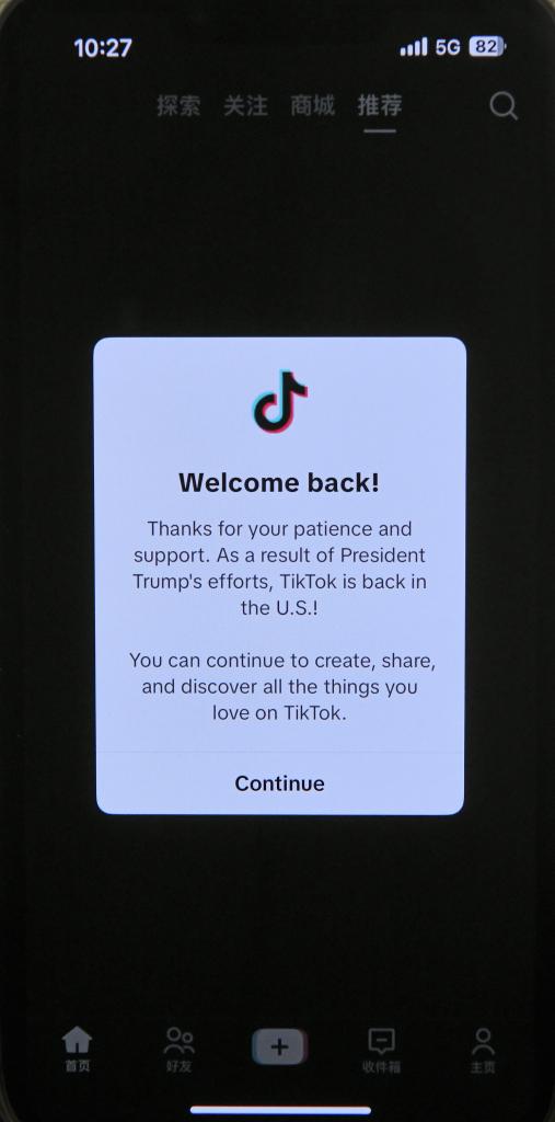 这是1月19日在美国阿灵顿拍摄的TikTok手机应用程序弹窗通告“欢迎回来!”。新华社记者 李睿 摄