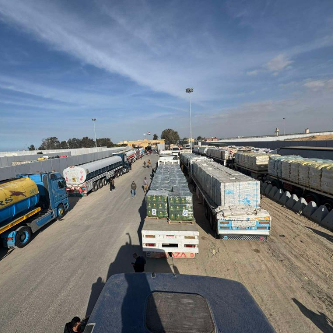 1月19日,运送援助物资的卡车在拉法口岸埃及一侧等待进入加沙。