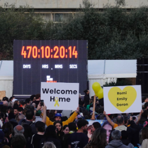 1月19日,人们在以色列特拉维夫的一座广场集会,欢迎3名以色列人被释放。新华社记者 王卓伦 摄