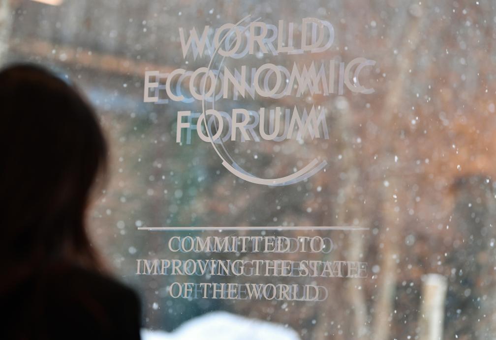1月23日,在瑞士达沃斯,参会者走过世界经济论坛标识。新华社记者连漪摄