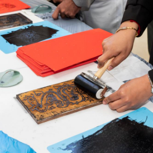 1月24日,在尼泊尔首都加德满都,观众在年画展上体验木版年画制作。 新华社发(哈里·马哈尔詹摄)