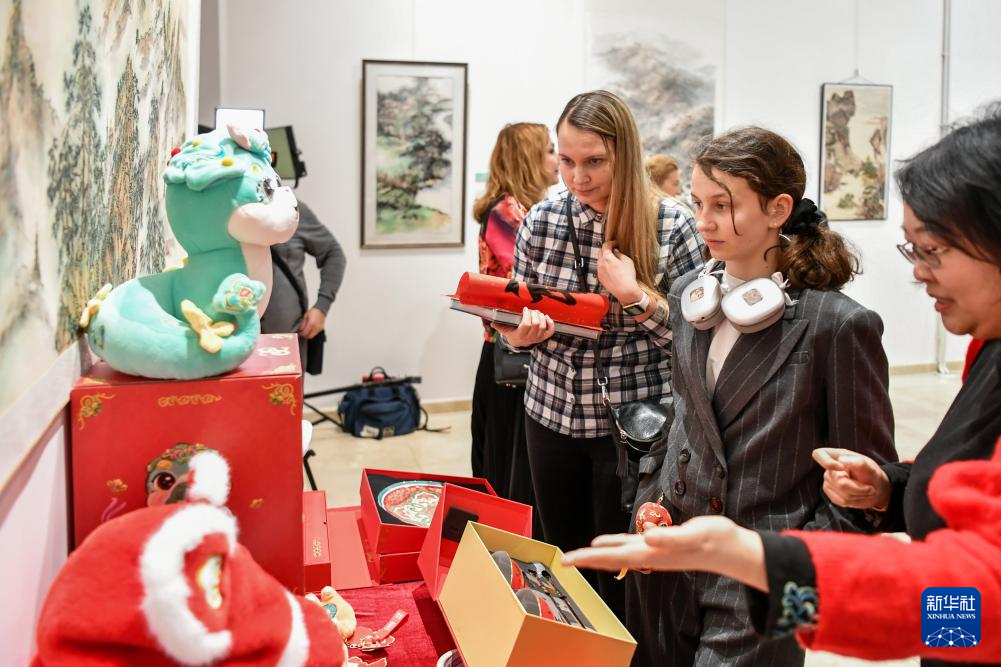 1月25日,人们在俄罗斯莫斯科中国文化中心观看文创产品。