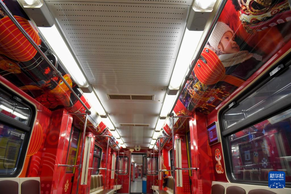 记者看到,这列春节主题地铁列车的红色车身上绘有巨龙、蛇等元素,列车内部以红色为底色,配有展示中国各地春节庆祝活动的图片。据介绍,列车将在莫斯科地铁3号线运行约一个月。