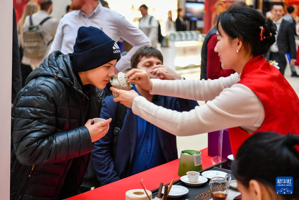 1月28日,在俄罗斯莫斯科举行的新春庙会活动上,游客在品茶。
