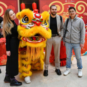 1月28日,在俄罗斯莫斯科举行的新春庙会活动上,人们与舞狮表演者合影。