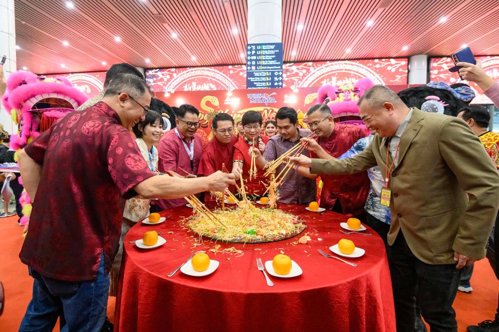 1月29日,马来西亚吉隆坡国际机场举办春节期间传统习俗活动——“捞鱼生”仪式。新华社发 (张纹综摄)
