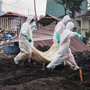2月5日,在刚果(金)北基伍省首府戈马市,工作人员转移遇难者遗体。