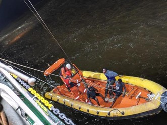 1时05分,“创力”轮甲板值班人员在安全巡视时听到海面传来呼救声,随后发现一艘木质渔船遇险,3人落水急需救援。“创力”轮立即启动应急预案,指挥驾驶台启用探照灯、强光手电及无人机锁定落水人员位置,船舶动力系统紧急备车并调整救援姿态,救助艇进入待命状态,为救援争取宝贵时间。1时08分,无人机传回实时画面:3名落水者正拼命挣扎,生死悬于一线。情况危急,刻不容缓,“创力”轮立刻下放救助艇,展开救援。1时20分,救援小组成功将3名落水渔民转移至救助艇,随后将其安全带回“创力”轮。
