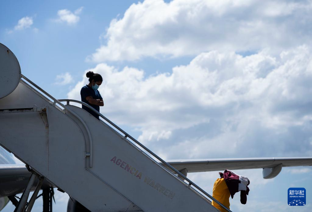 2月14日,在洪都拉斯西北部城市圣佩德罗苏拉的拉蒙·比列达·莫拉莱斯机场,返乡移民走下飞机。新华社发(戴维 摄)