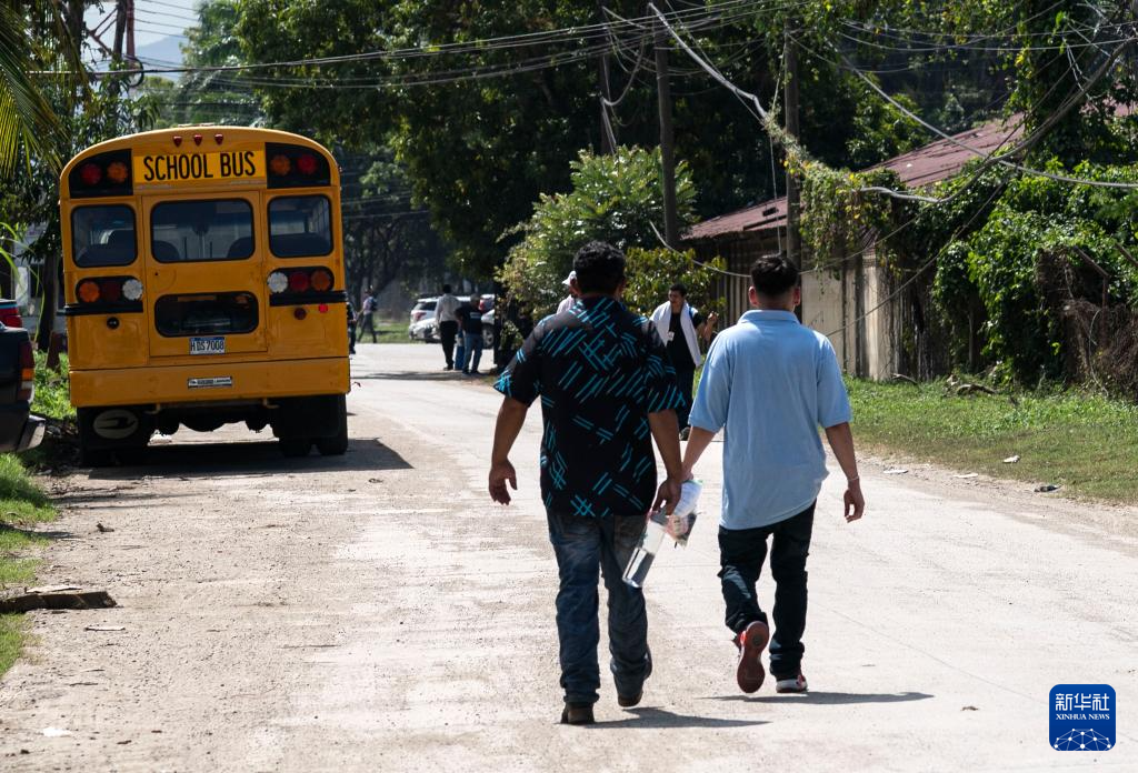 2月14日,在洪都拉斯西北部城市圣佩德罗苏拉,两名返乡移民步行离开返乡移民援助中心。新华社发(戴维 摄)