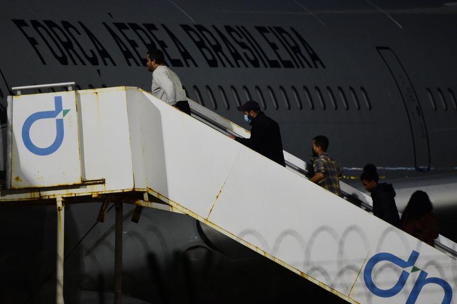 2025年2月7日,在巴西东北部塞阿拉州福塔莱萨市,被美国驱逐出境的第二批巴西非法移民登上一架巴西空军飞机。新华社发(卢西奥·塔沃拉摄)