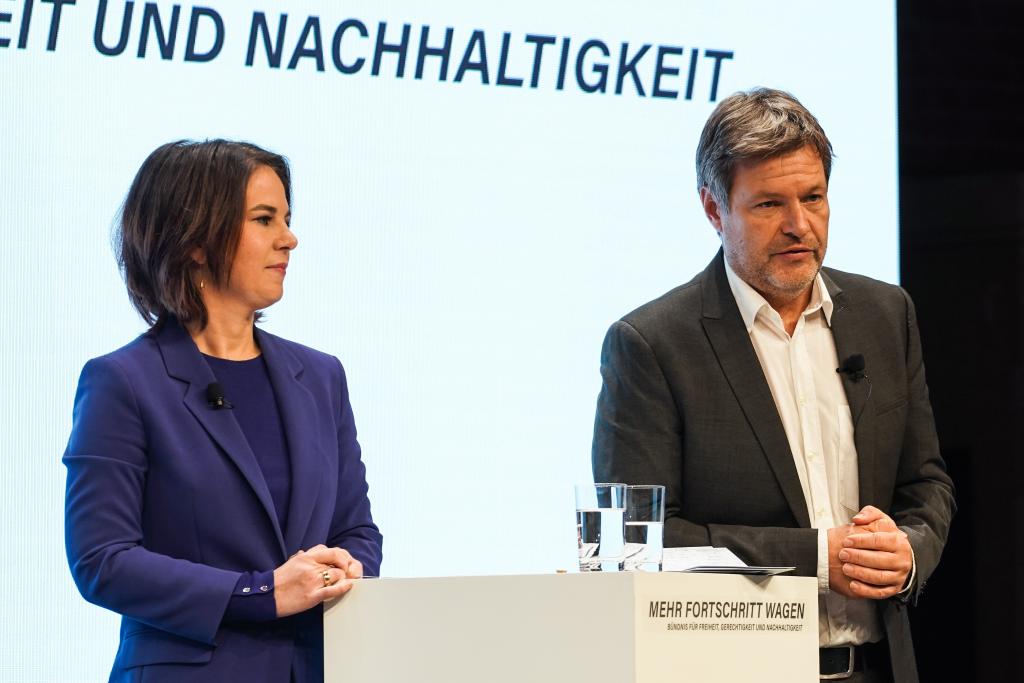 2021年11月24日,在德国首都柏林,哈贝克(右)与绿党联席主席贝尔伯克出席新闻发布会。新华社发(斯特凡·蔡茨摄)