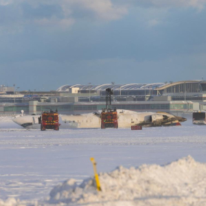 2月17日,在加拿大多伦多皮尔逊国际机场,一架客机倒翻在跑道上。