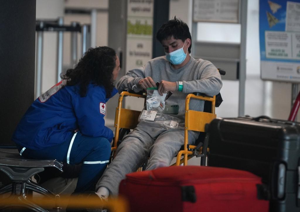 1月28日,一名被美国遣返的哥伦比亚籍非法移民(右)在哥伦比亚首都波哥大的埃尔多拉多国际机场接受工作人员帮助。新华社发(安德烈斯·莫雷诺摄)