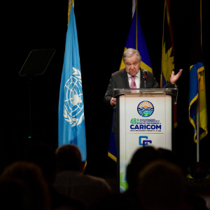 2月19日,在巴巴多斯首都布里奇敦,联合国秘书长古特雷斯在加勒比共同体(加共体)第48届政府首脑会议开幕式上发言。