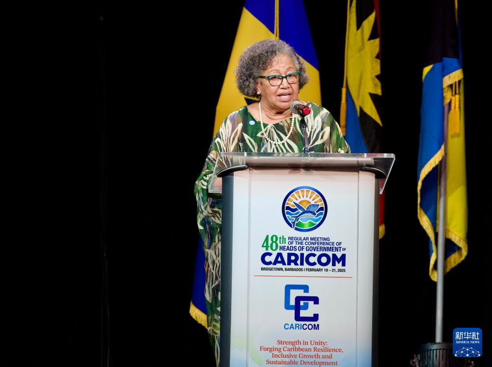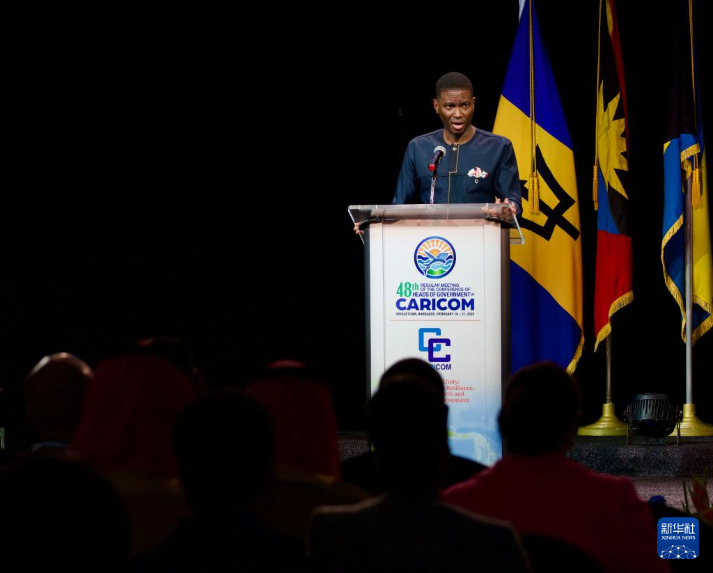 2月19日,在巴巴多斯首都布里奇敦,加勒比共同体(加共体)轮值主席、东道国巴巴多斯总理莫特利在加共体第48届政府首脑会议开幕式上发言。